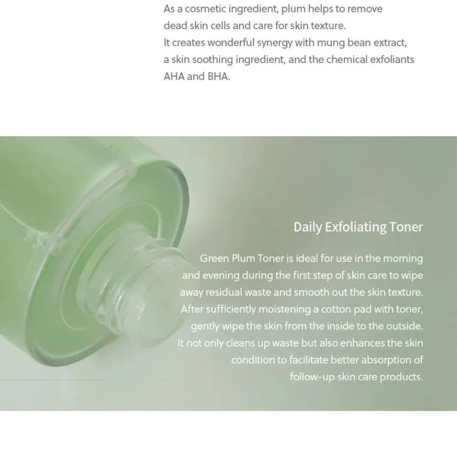 Beauty of Joseon Green Plum Refreshing toner: AHA+BHA exfoliates the stratum corneum, prevents clogging of pores and the appearance of comedones, washes away remaining impurities, removes excess sebum and dead skin particles.