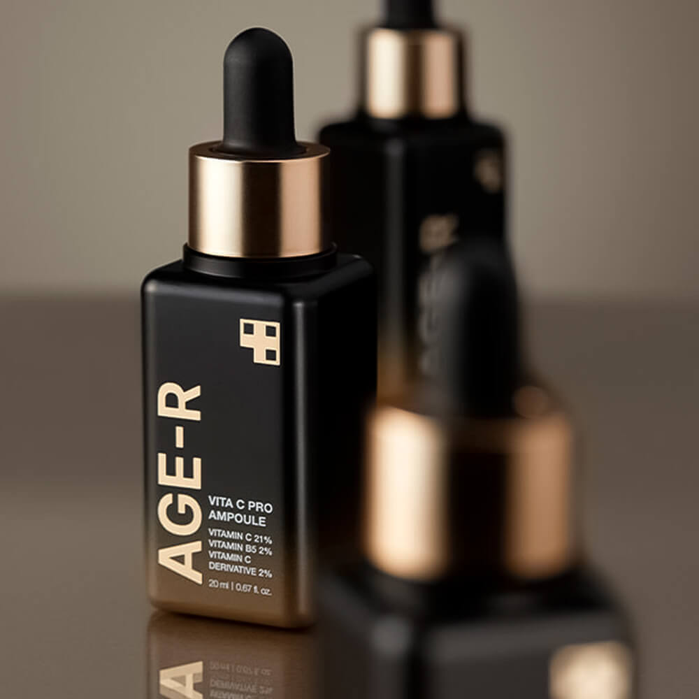 Medicube AGE-R Vita C Pro Ampoule skin lightening ampoule contains a high concentration of ascorbic acid and its derivatives, which reduce the appearance of age spots and prevent the formation of new pigmentation.